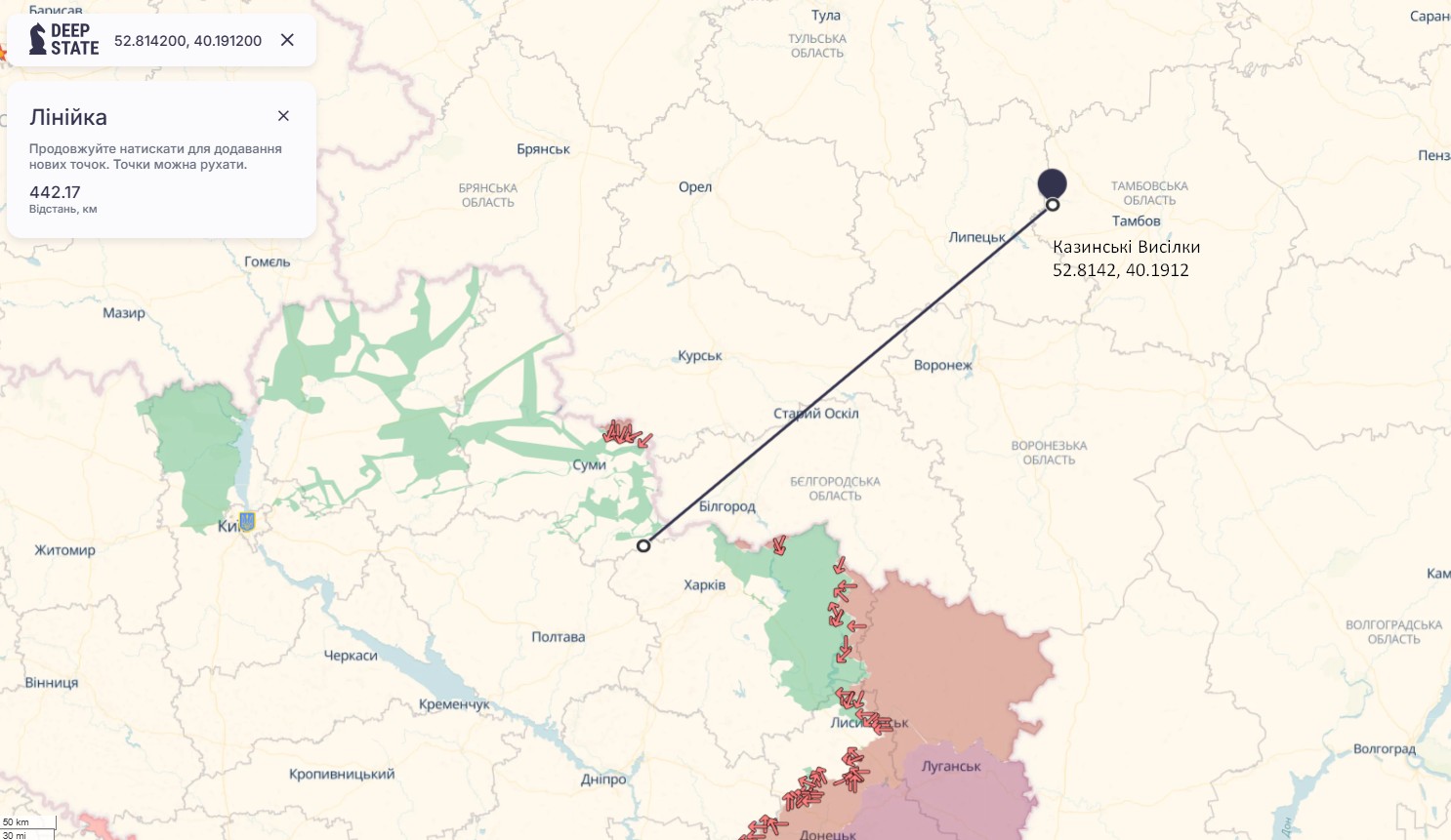 Казинские Выселки — село в Мичуринском районе Тамбовской области РФ, расположенное в 400 км от Украины. Если туда добрались диверсанты (а не действовали местные силы сопротивления), то им пришлось бы незаметно пройти три-четыре российские области (Курскую или Белгородскую, Воронежскую, Липецкую — если идти по прямой).
