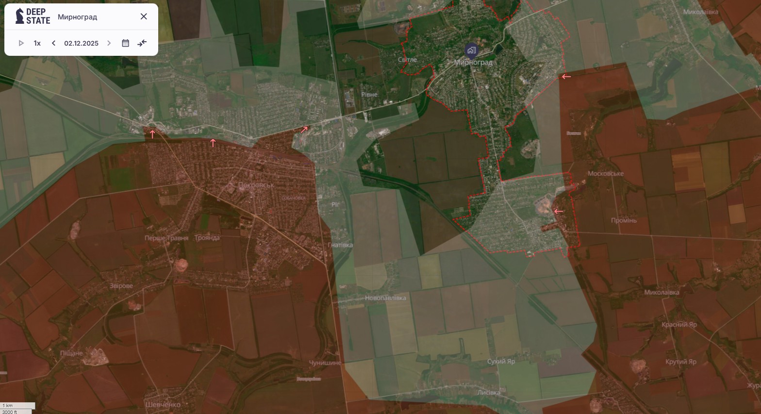 На карте аналитиков проекта DeepState последние изменения на карте боевых действий показаны по состоянию на 2 декабря. Аналитики показали выступ в серой зоне, который тянется от окраин Покровска до Мирнограда вдоль трассы Т-0504. Севернее — пока свободный перешеек шириной до 1 км: захватывает поля возле Красного Лимана и часть дороги, которая ведет через Родинское в Доброполье.