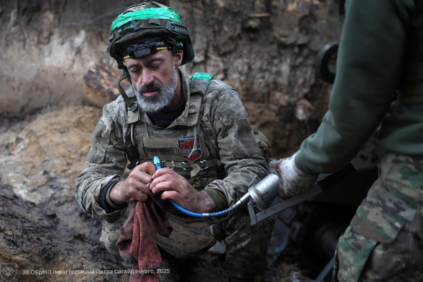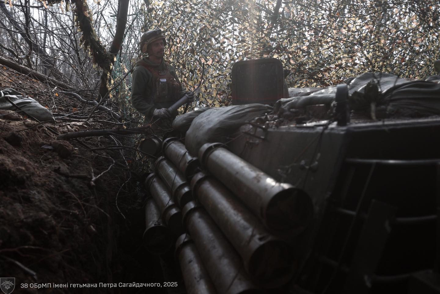 Артиллеристы 38 отдельной бригады морской пехоты имени гетмана Петра Сагайдачного воюют в полосе ответственности 7 корпуса быстрого реагирования ДШВ ВСУ. На фото с места боев — бойцы рядом с пушкой, замаскированной на позициях, и куча снарядов, готовых к работе.