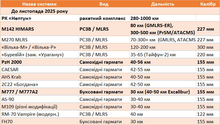 В ноябре 2025 года возможности артиллеристов и ракетных выросли, поскольку армия получила новое украинское оружие и западную помощь. В течение четырех лет войны дальность ракет "Нептун" выросла втрое и достигла 1000 км. Также изменились возможности РСЗО и пушек благодаря технике Франции, США и других партнеров.