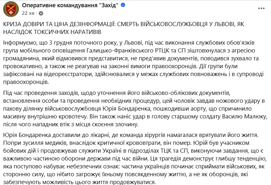 Трагический инцидент произошел 3 декабря, когда группа мобильного оповещения двигалась по улицам Львова и проверяла военноучетные документы, говорится в заявлении ОК "Запад" и Львовского областного ТЦК и СП на странице Facebook. Работники Галицко-Франковского РТЦК и СП встретили гражданина, который вел себя агрессивно. Во время разговора мужчина выхватил нож и ударил военнослужащего Бондаренко. От раны, полученной средь бела дня во Львове, боец ВСУ скончался в больнице. Другой военный получил удар в голову.
