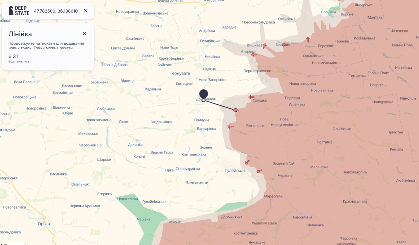 На карте аналитиков проекта DeepState можно отыскать село Доброполье Пологовского района Запорожской области. Населенный пункт площадью 2,3 кв. км, в котором до большой войны жило 440 человек, расположен в 6 км от линии фронта. Гуляйполе — в 13 км к югу. Днем 3 декабря аналитики написали в Telegram-канале, что ВС РФ продвинулись на этом участке: речь идет о полях к северо-востоку от Гуляйполя, со стороны Затишья.