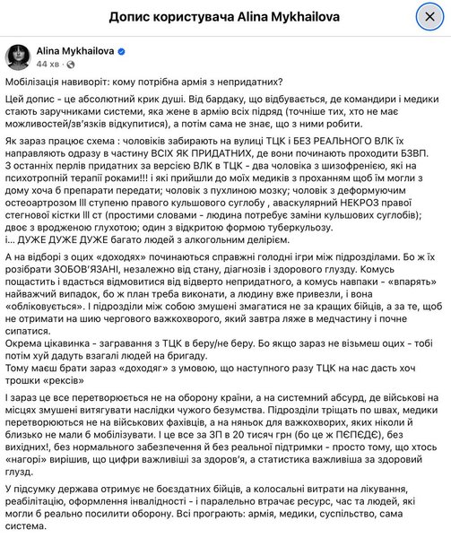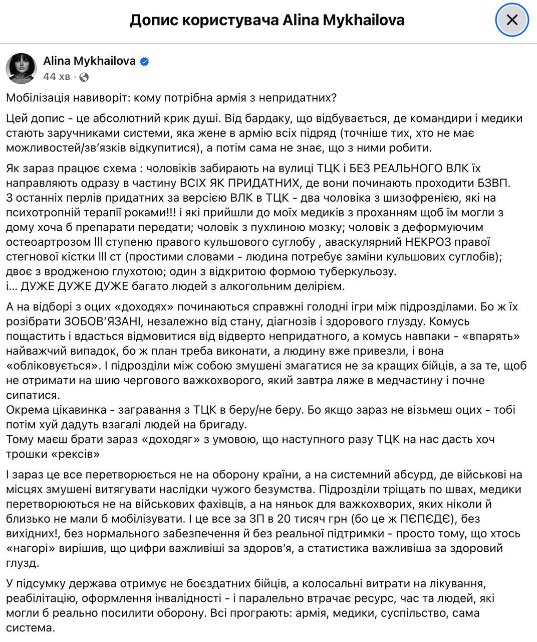 "И сейчас это все превращается не в оборону страны, а в системный абсурд, где военные на местах вынуждены извлекать последствия чужого безумия. Подразделения трещат по швам, медики превращаются не в военных специалистов, а в нянек для тяжелобольных, которых никогда и близко не должны мобилизовать", — сетует автор, подчеркивая, что это все — за зарплату в 20 тысяч гривен.