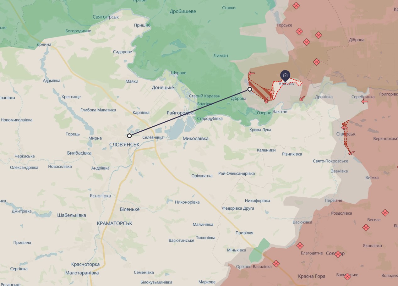 Продвижение противника было зафиксировано восточнее города Ямполь, причем сам населенный пункт на карте обозначен серой зоной вдоль русла реки Северский Донец. Это может свидетельствовать о том, что на участке по линии Озерное — Дроновка — Северск российские войска не преодолели водной преграды и не угрожают ударом в тыл подразделениям Сил обороны у Северска.