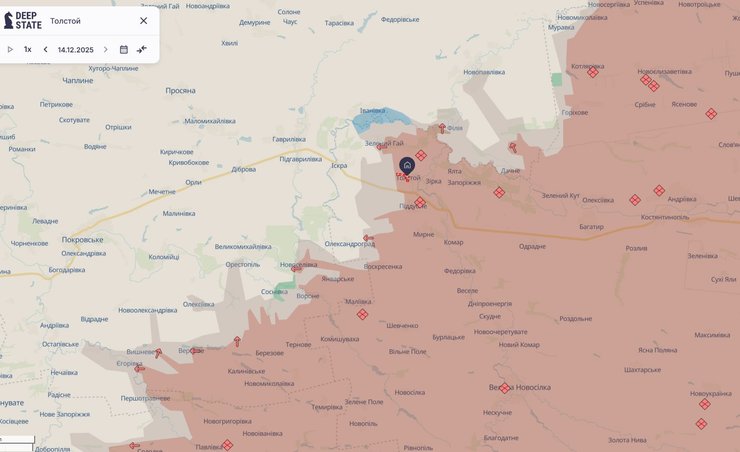 В период с 13 по 14 декабря российские войска сумели продвинуться на трех участках фронта — на восточном фланге Славянском направления, а также на Александровском направлении, юго-запада Донецкой области. Об изменениях на линии боевого соприкосновения сообщили аналитики ресурса DeepState.
