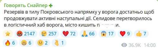 Сообщение Бунятова появилось в полдень 17 декабря. Военный сообщил, что ВС РФ имеют резервы для продолжения наступления на Покровск. По его словам, россияне накапливают силы в ранее оккупированном населенном пункте — в Селидово. Не указывается, о каком количестве живой силы и техники ВС РФ идет речь, но боец написал, что россияне там "кишат".