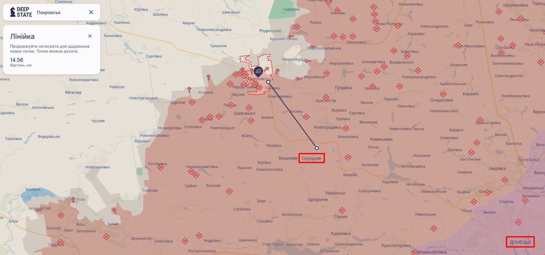 На карте боевых действий DeepState видим, что Селидово — город в Донецкой области, который ВС РФ оккупировали 29 октября 2024 года. В течение года "красная зона" российской оккупации продвинулась в сторону Покровска. Карта показывает, что в течение года подразделения ВС РФ прошли около 14 км (по прямой): именно такое расстояние необходимо преодолеть резервам, чтобы добраться до линии боев. Через город проходит трасса Е50, по которой из оккупированного Донецка россияне доставляют живую силу, технику, боеприпасы.