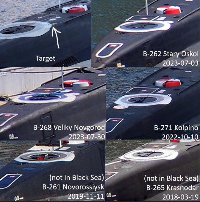 Исследователь сравнил конфигурацию пятен краски на корпусе на кормовом люке и установил, что россияне могли показать либо Б-271 "Колпино", либо Б-261 "Новороссийск", либо Б-265 "Краснодар". При этом последние две лодки — не в Черном море. Учитывая эти соображения, Duke BG сделал вывод, что в Новороссийске дроны СБУ поразили "Колпино".
