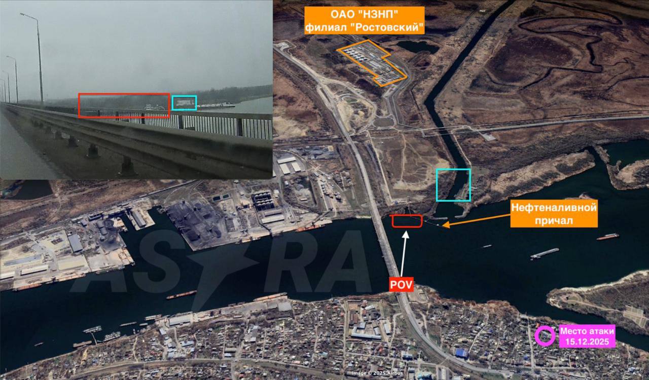 РосСМИ провело геолокацию фото и установило точку, в которой находится российский корабль. Выяснилось, что он стоит в 850 м от точки удара дронов, который произошел четыре дня назад, 15 декабря. После попадания начался пожар, напомнило медиа. Как уточнили на портале "Милитарный", появилась пробоина в машинном и румпельном отделении, есть повреждения рубки и корпуса.