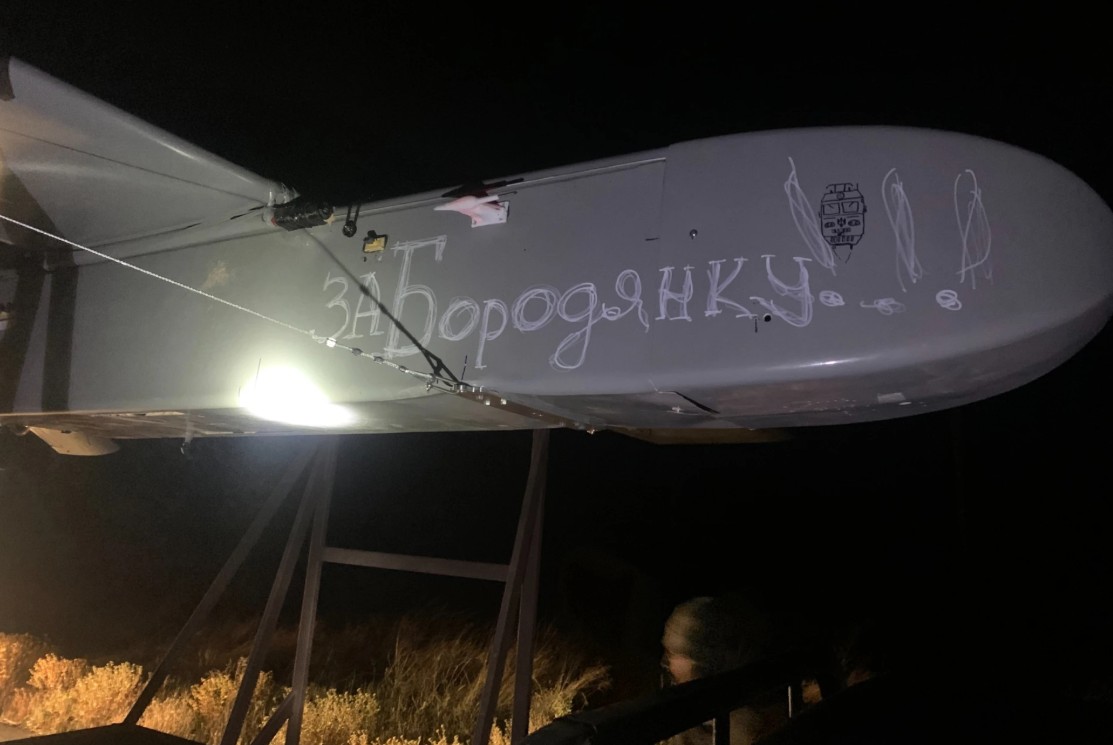 Цеха предприятия выглядят иначе, чем на первоначальных фото, опубликованных медиа Associated Press, говорится в статье. На самом деле они тесные, заставлены большим количеством стеллажей с пронумерованными корпусами, и несколько похожи на лабиринты. Отмечается, что теснота может быть связана с большим заказом Генштаба ВСУ, поскольку продукция — дроны deep strike (большой дальности) и middle strike (средней дальности) — показали свою эффективность: их использует, например, СБУ. Первый удар FP-1 — устройство с надписью "За Бородянку": медиа показали, как выглядело ударное средство Fire Point, которым в 2023 году ударили по российским войскам.