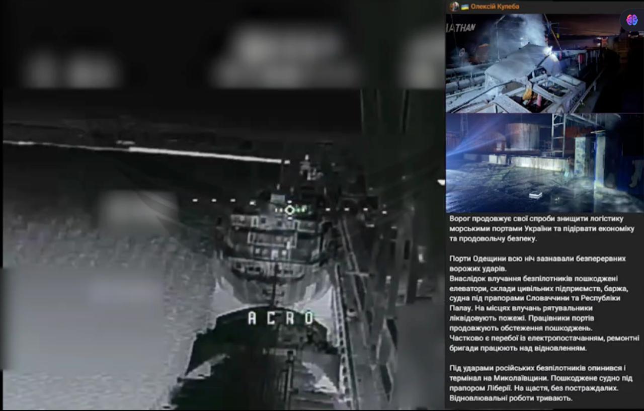 Третье фото — момент удара по грузовому судну в порту Николаева. Рядом со скриншотом записи дрона ВС РФ — сообщение вице-премьера Алексея Кулебы, который сообщил об атаке ВС РФ на гражданский корабль под флагом Либерии и по элеватору. Атака состоялась в ночь на 26 декабря.