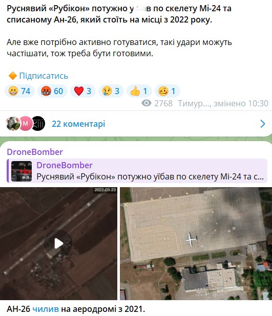 Некоторые детали относительно удара дронов РФ по аэродромам в тылу ВСУ добавили в Telegram-канале Drone Bomber. Указывается, что атаку выполнило российское подразделение "Рубикон", а поврежденный вертолет — это Ми-24. Кроме того, согласно данным авторов канала, обе единицы военной техники были в нерабочем состоянии. В частности, Ми-24 стоял на аэродроме с 2022 года, а Ан-26 — с 2021. В качестве доказательства, публикуется спутниковое фото с Google maps, на которых видно указанную технику.