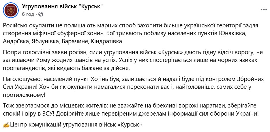 30 декабря на странице Facebook группировка войска "Курск" ВСУ прокомментировала события в Сумской области. Военные сообщили, что Кремль пытается создать "буферную зону" в регионе, а тем временем украинские бойцы удерживают наступление ВС РФ между селами Юнаковка (до Сумы 18 км по прямой и 28 км по трассе), Андреевка (18 км по прямой), Яблоновка (20 км), Варачино (столько же), Кондратовка (20 км).