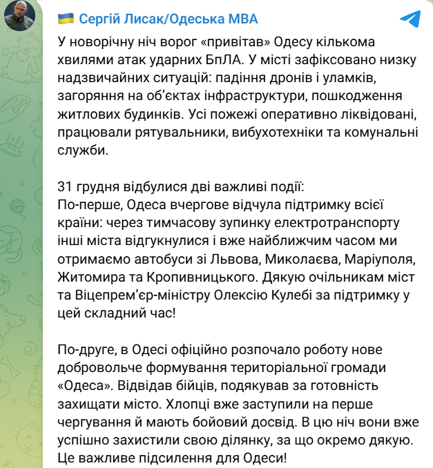 "В новогоднюю ночь враг "поздравил" Одессу несколькими волнами атак ударных БпЛА. В городе зафиксирован ряд чрезвычайных ситуаций: падение дронов и обломков, возгорания на объектах инфраструктуры, повреждения жилых домов", — написал Лысак.