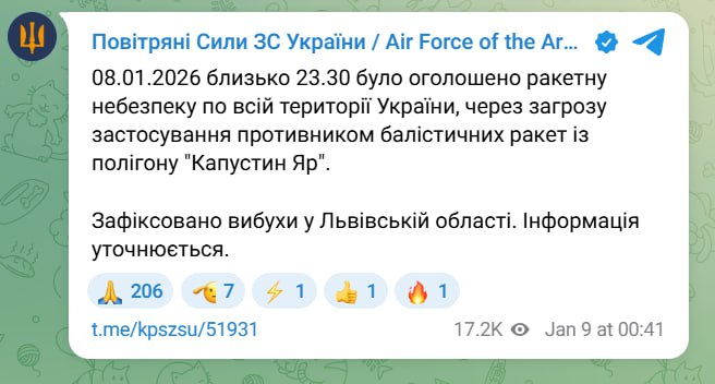 "08.01.2026 около 23.30 было объявлено ракетную опасность по всей территории Украины, из-за угрозы применения противником баллистических ракет с полигона "Капустин Яр". Зафиксированы взрывы во Львовской области. Информация уточняется", — отметили в ВС ВСУ.