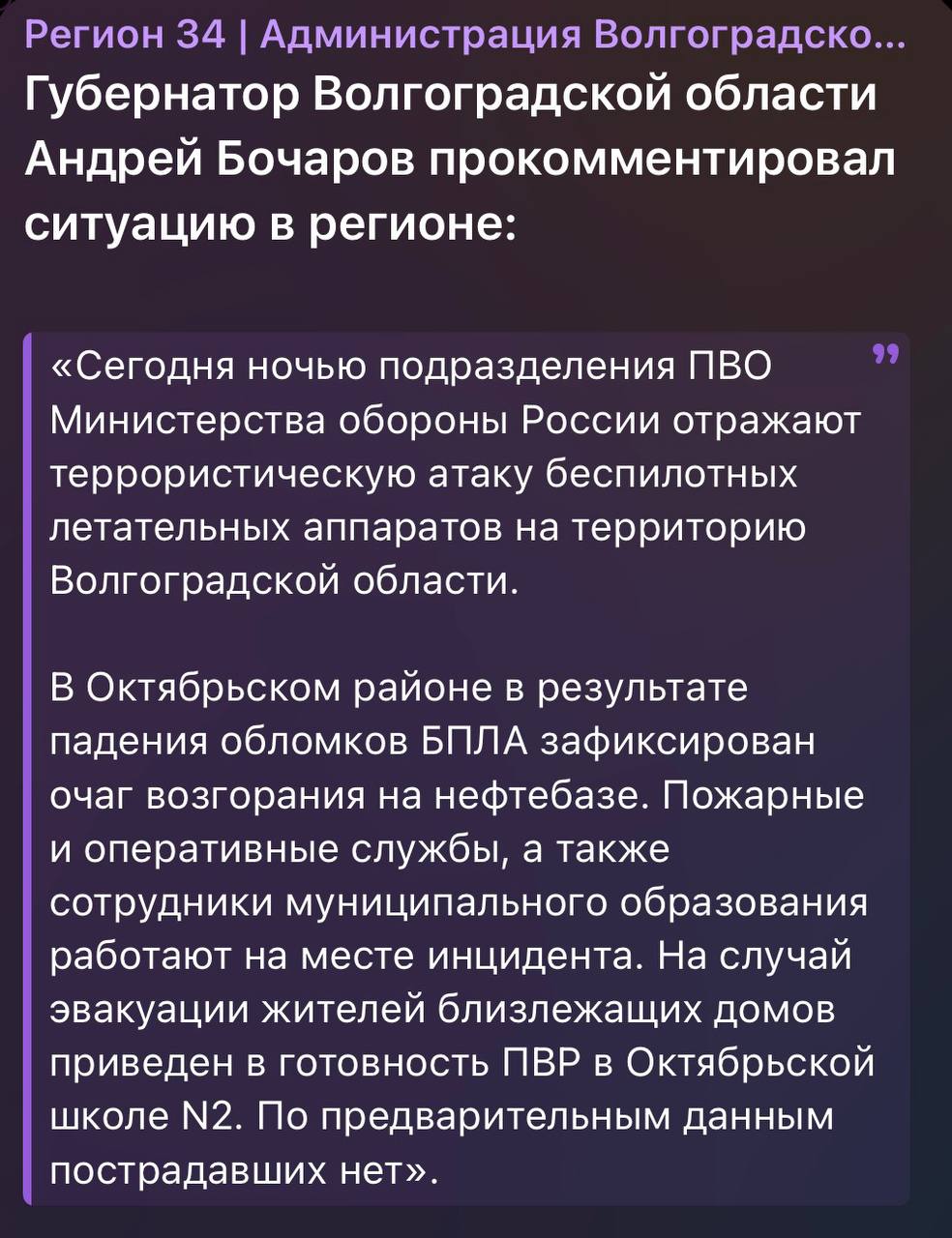 Российская ПВО якобы всю ночь отражала удары дронов по территории Волгоградской области, сообщил ее губернатор Андрей Бочаров.