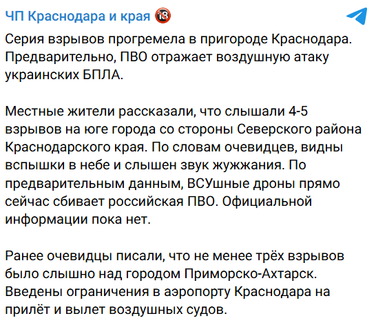 В то же время местные телеграм-каналы Краснодраского края также сообщили об ударах беспилотников по региону. Местные жители слышали около пяти взрывов в пригороде Краснодара. По словам очевидцев, были видны вспышки в небе и слышен звук жужжания.