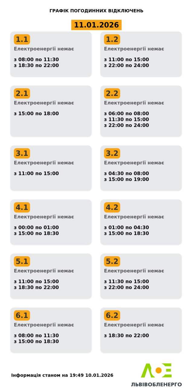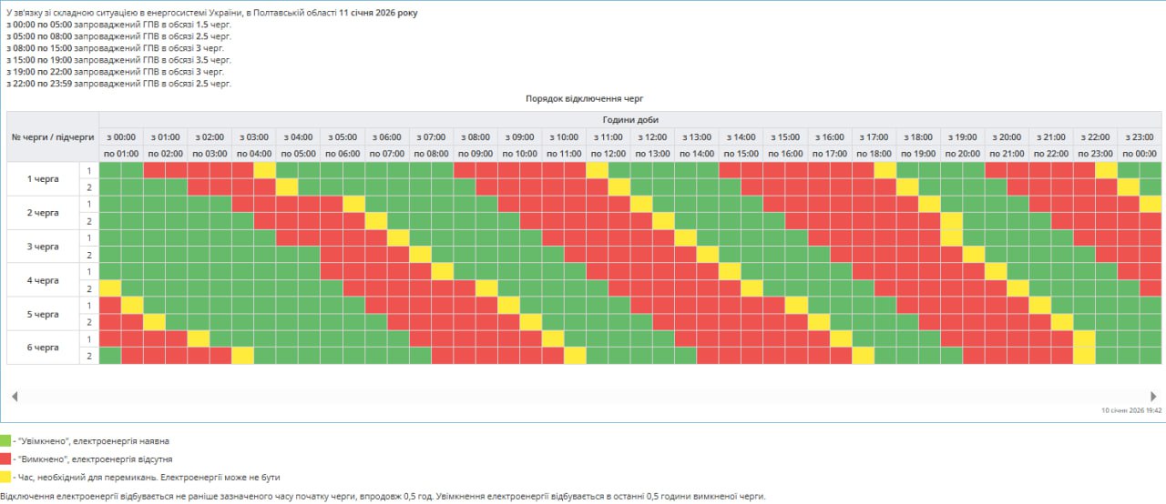 В Полтавской области также будут применены графики почасовых отключений на 11 января. Местные энергетики сообщают, что продолжительность отсутствия света в очереди будет составлять от 8,5 до 10,5 часов на следующие сутки.