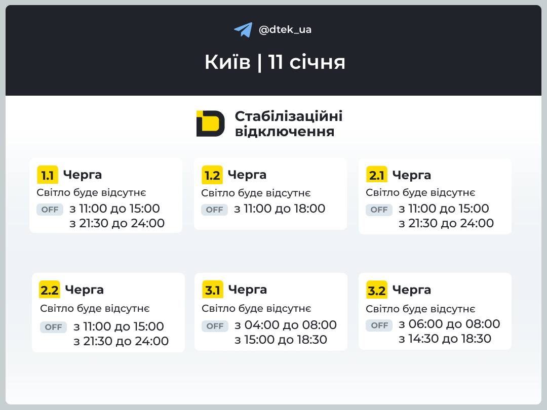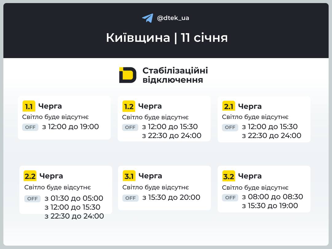 ДТЭК и ряд облэнерго обнародовали новые графики почасовых отключений для регионов Украины на 11 января. Сейчас в части столичных районов и нескольких районов Киевской области применяются аварийные графики.