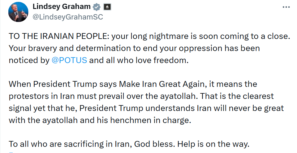 "Когда президент Трамп говорит "Сделаем Иран снова великим", это означает, что протестующие в Иране должны победить аятоллу. Это самый ясный сигнал о том, что президент Трамп понимает: Иран никогда не будет великим, пока у власти находятся аятолла и его приспешники", — говорится в сообщении сенатора.