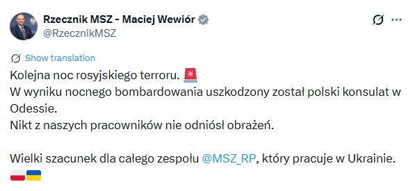 В частности, под удар попало здание генерального польского консульства в Одессе, сообщил спикер Министерства иностранных дел Польши Мацей Вевюр.