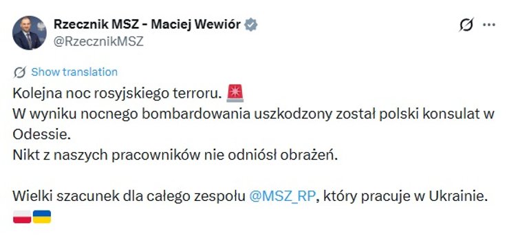 "Еще одна ночь российского террора. Польское консульство в Одессе пострадало в результате ночного взрыва. Никто из наших сотрудников не пострадал. Выражаю глубокое уважение всей команде МИД Польши, работающей в Украине", – написал он в Х.