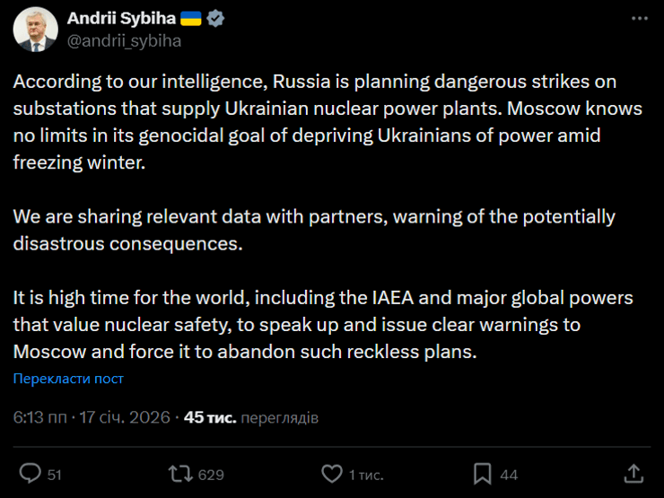 Россия готовит удары по подстанциям АЭС: Сибига предупреждает о катастрофических последствиях
