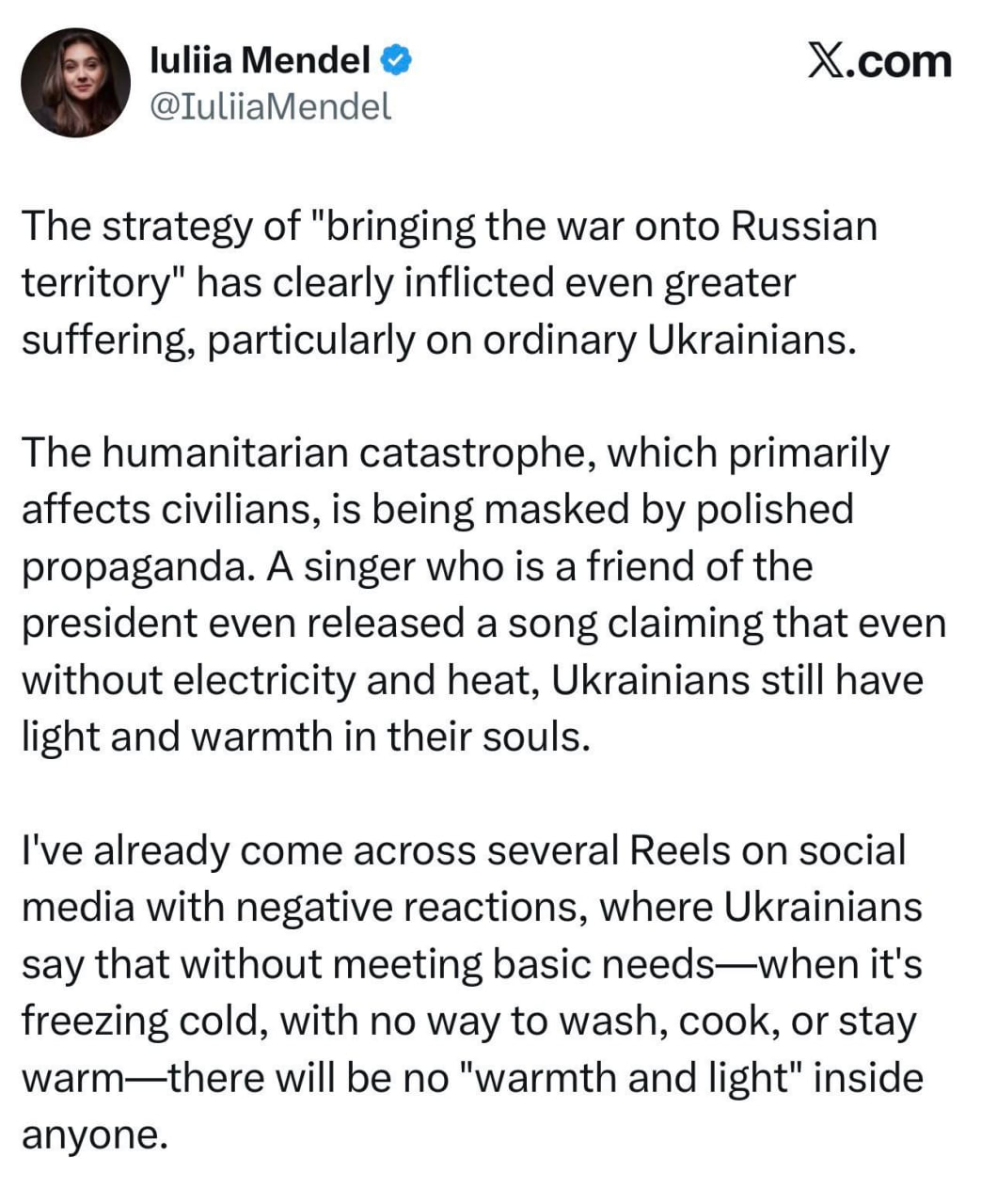 Также журналист приводит пример поста Юлии Мендель на странице в X, где она, в частности, поделилась мнением, что стратегия "переноса войны на территорию России", по ее мнению, лишь ухудшила жизнь рядовых украинцев, а настоящие масштабы гуманитарного кризиса якобы скрываются за красивыми словами и публичными месседжами о стойкости.