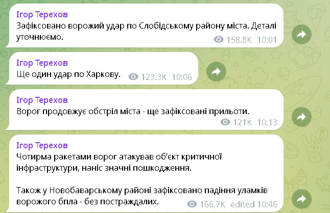 Впоследствии, в 10:46 Терехов сообщил, что четырьмя ракетами враг атаковал объект критической инфраструктуры, нанеся значительные повреждения. Также в Новобаварском районе зафиксировано падение обломков вражеского БПЛА, и на то время, информации о пострадавших не было.