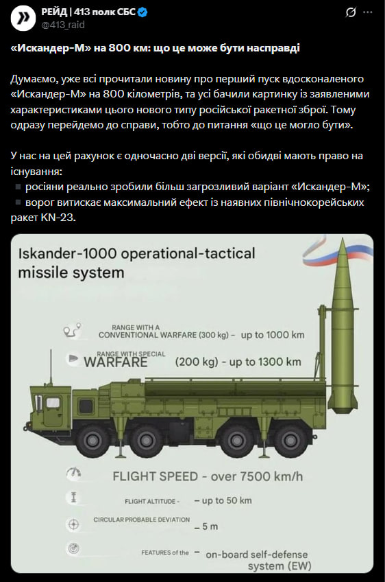 В декабре 413 полк Сил беспилотных систем ВСУ комментировал информацию о возможности применения ракеты "Искандер-М" на 800 км. Там отмечали, что еще в июле 2024 года российские пропагандисты начали говорить о якобы наличии у них баллистического "Искандер-1000", сопровождая это все фотографиями соответствующей пусковой установки.