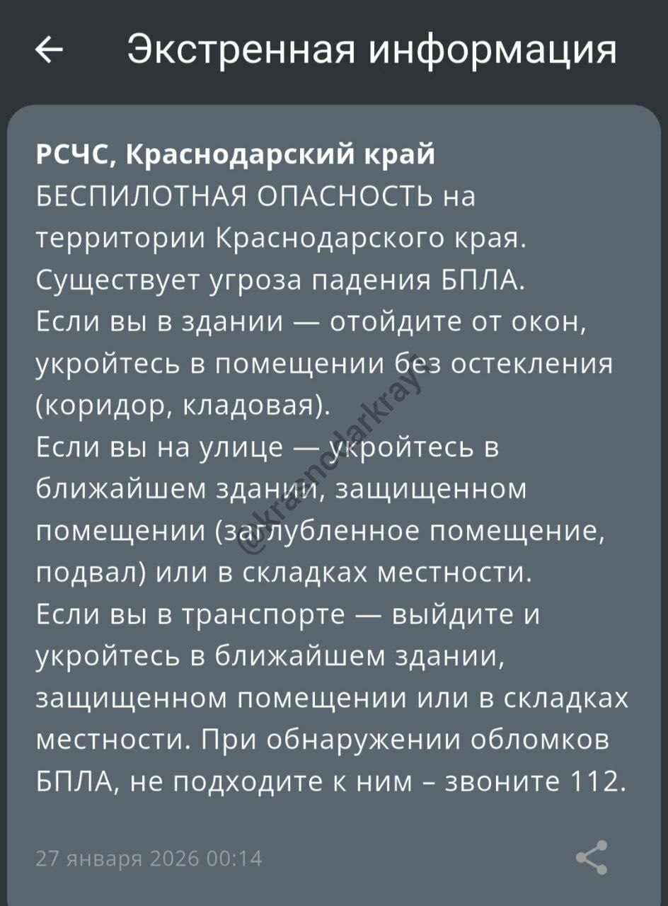 Воздушную тревогу в регионе объявили еще около полуночи. Российские мониторинговые каналы предупреждали о движении дронов курсом на область. "Росавиация" ввела ограничения в аэропорту Краснодара на посадку и вылет самолетов.
