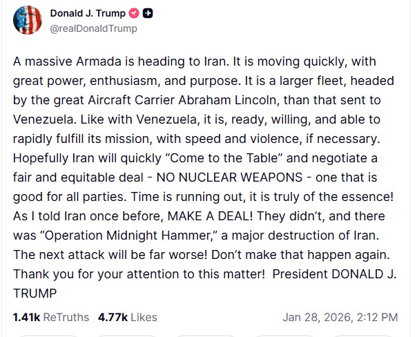 Днем 28 января Трамп опубликовал пост в соцсети Truth Social, в котором говорится о новой спецоперации США против Тегерана. Глава Белого дома предупредил, что приближается "массивная армада", во главе которой — авианосец "Авраам Линкольн". По его словам, иранским властям угрожает флот, больший, чем задействованный во время операции в Венесуэле ("Южное копье"). Кроме того, есть напоминание о соглашении по ядерному оружию, которое Иран не должен получить. Чтобы этого добиться, летом провели операцию "Полуночный молот", а нынешний удар будет еще сильнее, считает американский лидер.