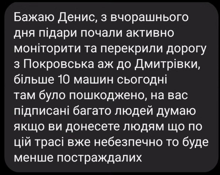 Он также опубликовал скрин комментария, в котором один из очевидцев предупреждает о том, что с 27 января оккупанты начали активно мониторить и перекрывать дорогу из Покровска до Дмитриевки, поразив более 10 автомобилей.