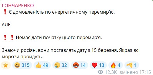 Сообщение Гончаренко появилось около 17 часов 29 января. Нардеп подтвердил информацию из соцсетей о возможности энергетического перемирия, но не объяснил, из какого источника получил такие данные.