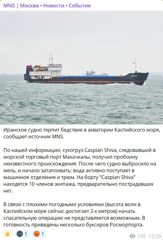Стерненко ссылается на информацию, опубликованную в Telegram-канале MNS, в котором подробно описывается, что произошло с Caspian Shiva. Указано, что по дороге в Махачкалу корабль получил пробоину по неизвестным причинам, начал тонуть и сел на мель: место, где это произошло, не известно. На борту сухогруза находится 10 членов экипажа, тем временем вода заливает машинный отсек и трюм, говорится в заметке. Тем временем на море — шторм и двухметровые волны. Учитывая это, спасательную операцию пока провести не могут, хотя наготове стоят буксиры "Росмортпарта".