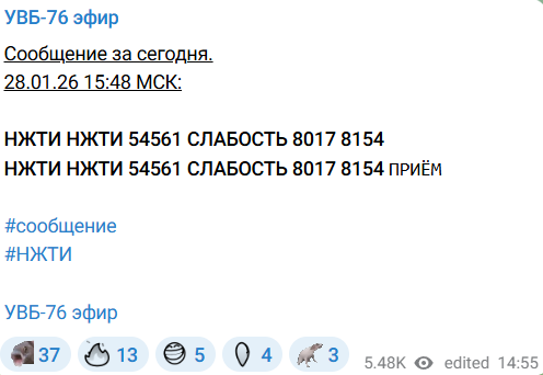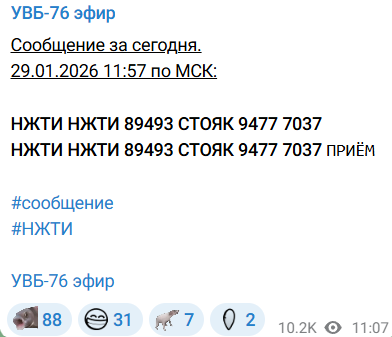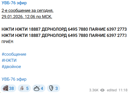 Сообщения "радиостанции Судного дня" в день заявлений российских военкоров о запрете ВС РФ на удары по энергообъектам Украины опубликованы в Telegram-канале "УВБ-76 эфир", который круглосуточно транслирует вещание "Жужжалки". Станция 29 января передала два набора цифр, российских букв и слов.