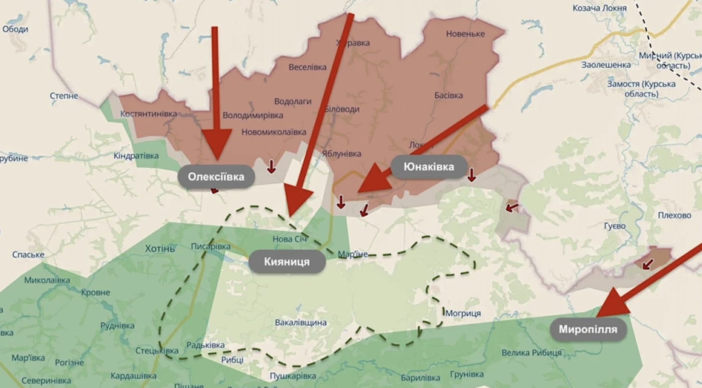 Основным направлением давления российских войск остается участок, захваченный ими между селами Алексеевка — Яблоновка — Юнаковка. Об этом пишет "Украинская правда" со ссылкой на источник в разведке. С этого плацдарма противник развивает наступательные действия сразу по трем "ветвям", которые тянутся в направлении населенных пунктов Хотень, Писаревка и Новая Сечь.