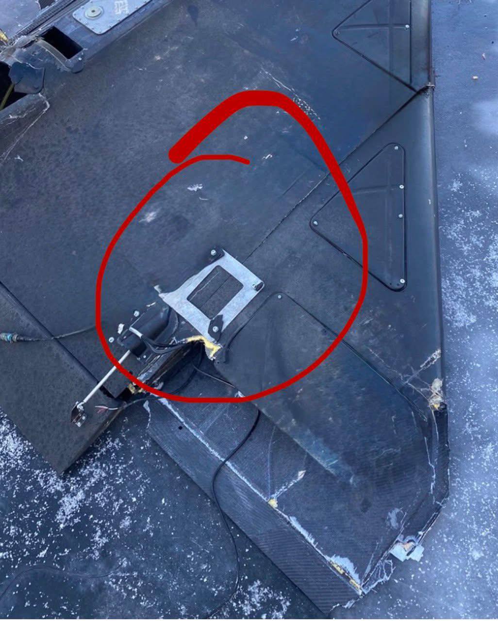 Эксперт также опубликовал фото обломков "Шахеда", который был носителем FPV-дрона. На одном фото — фрагмент крыла с остатками мини-беспилотника. На другом — кусок корпуса с креплением, с которого стартовал российский БпЛА.