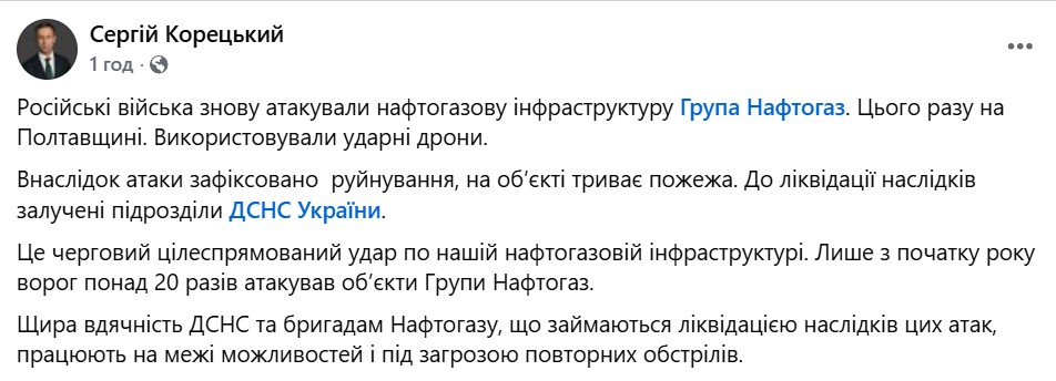 Информация об очередном попадании по нефтегазовой инфраструктуре появилось утром 20 февраля, после ночных событий, когда россияне запустили по украинцам стаей дронов и баллистикой. "Нафтогаз" не детализировал район Полтавской области, который попал под ночной удар. Отмечается, что удары происходят регулярно и с начала 2026 года насчитали 20 таких инцидентов (без учета сегодняшнего). На странице главы правления НАК "Нафтогаз" Сергея Корецкого — лаконичный пост о попадании и благодарность спасателям.