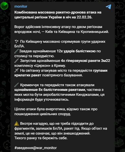 Основными целями этой атаки стали Киев и Киевская область, а также Кропивницкий, Кременчуг и ряд других регионов страны. Предварительные выводы об атаке сообщает мониторинговый канал monitor.