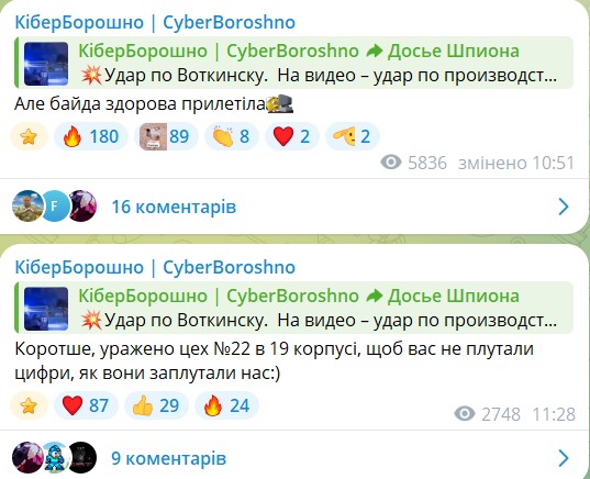 21 февраля в сети опубликовали детали удара ракеты "Фламинго". Подтвердили поражение двух цехов и об 11 раненых, один из них — в тяжелом состоянии. На следующий день в OSINT-канале "КиберБорошно" опубликовали спутниковые фото результатов поражения. На фото — крыша цеха Воткинского завода с отверстием размером 30 на 24 м. Также отмечалось, что могло произойти попадание по гальвано-штампувальноу цеху №19: 25 февраля выяснилось, что речь идет о цехе №22.