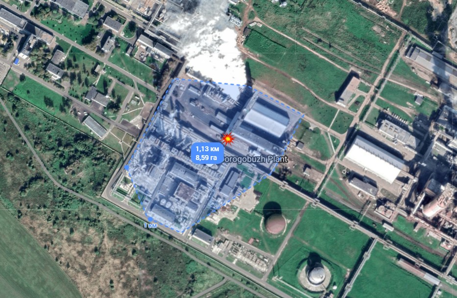 Аналитики указали координаты точки попадания на заводе "Дорогобуж" в ночь на 25 февраля — 54.9478600,33.3679639. Указанные координаты можно отыскать на Google maps и ориентировочно установить площадь черного пятна на территории предприятия, — это почти 86 тыс. кв. м. Самое дальнее расстояние от точки попадания до края черного пятна — около 219 м.
