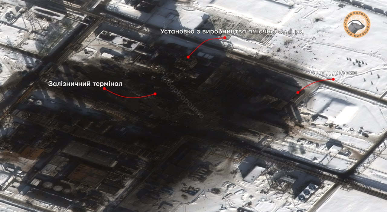 В заметке "КиберБорошна" объясняется, какие объекты на заводе задел взрыв. Выяснилось, что после попадания произошла цепь взрывов, которые пронеслись по стоянке транспорта, железнодорожному терминалу и по складу продукции. По оценке OSINTерів, ударная волна разрушила установку по производству аммиачной селитры. Вокруг точки попадания разлетелись обломки в радиусе сотни метров, которые повредили окружающие производственные сооружения, говорится в сообщении.