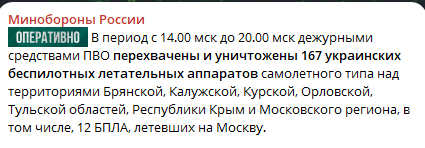 В российском оборонном ведомстве заявили, что в период с 14:00 до 20:00 по московскому времени системы ПВО якобы ликвидировали 167 БПЛА, сообщает Telegram-канал Минобороны РФ. Речь идет о Брянской, Калужской, Курской, Орловской и Тульской областях, а также об аннексированном Крыме и Московском регионе. Об этом также сообщают росСМИ.