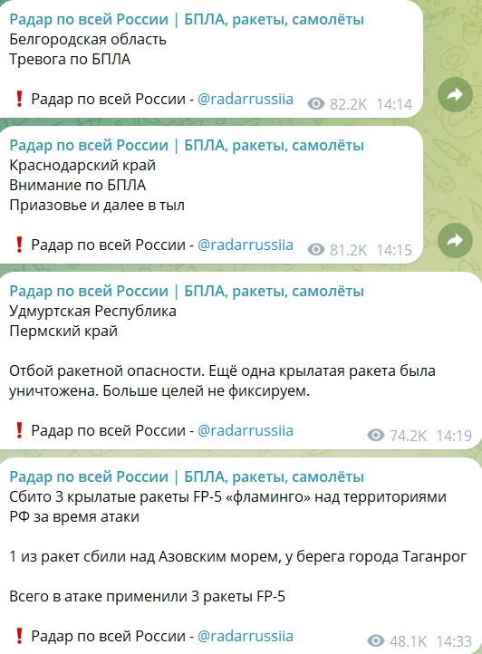 По серии сообщений в мониторинговых пабликах РФ российские журналисты составили ориентировочную траекторию ракет "Фламинго". В частности, выяснилось, что началось все около 10 ч для Ростова и Волгограда. После того, пройдя ряд областей, около 13-14 ч два дальнобойных средства поражения якобы добрались до Чувашии, одну сбили средства ПВО, а вторая полетела дальше — в Пермскую область. Кроме того, перечисляются регионы, в которых объявили тревогу прямо посреди дня: Пермь, Удмуртия, Татарстан, Башкирия, Свердловск, Оренбург. На телеканалах [например, Татарстана] появилось предупреждение, в котором россиян просили немедленно пройти в укрытие, взяв самые необходимые вещи. РосСМИ ко всему уточнили, что закрылись школы, аэропорты и отменились массовые мероприятия. В 14:35 появилось сообщение об итогах ракетного удара: вроде бы было три "Фламинго", которые все сбили.