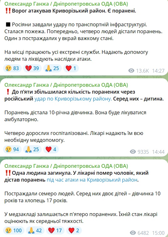 Глава Днепропетровской областной военной администрации Александр Ганжа написал в Telegram-канале, что среди пострадавших — 10-летняя девочка и 17-летний парень.