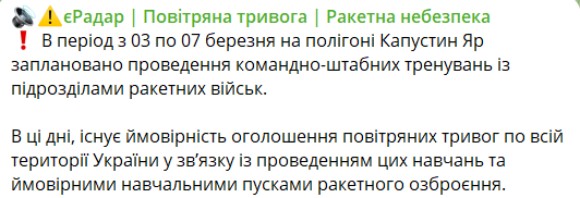 Учения проходят с 3 по 7 марта, в связи с чем существует вероятность объявления воздушных тревог по всей территории Украины в связи с проведением этих учений и вероятными учебными пусками ракетного вооружения, сообщает мониторинговый канал "єРадар".