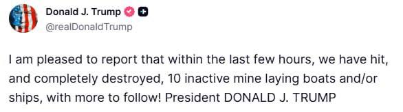"Я рад сообщить, что за последние несколько часов мы поразили и полностью уничтожили 10 неактивных минных судов и/или кораблей, и это еще не все!" — гласит публикация.