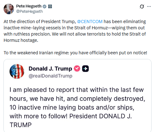 "По указанию президента Трампа @CENTCOM уничтожает неактивные минные суда в Ормузском проливе — уничтожая их с безжалостной точностью. Ослабленному иранскому режиму: вы официально предупреждены!", – говорится в его посте в Х.