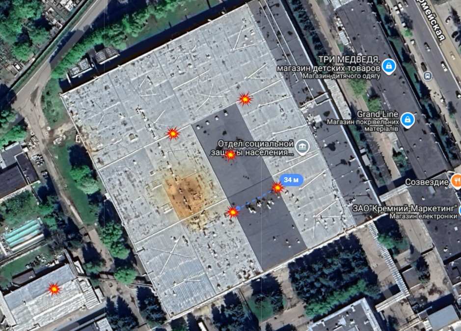 В канале "КиберБорошно" также уточнили, из-за масштабности повреждений аналитики сомневаются, сможет ли завод работать и поэтому, вероятно, его выведут из эксплуатации. При этом на спутниковых фото, опубликованных OSINTерами, — крыша крупнейшего производственного цеха площадью почти 20 тыс. кв. м и размерами, условно, 140 на 140 м. На этой стометровой площадке — пять черных пятен и следы удара ракет Storm Shadow: каждая весит полторы тонны и каждая взорвалась, вероятно, внутри цеха. Ракеты вырвали секции крыши вплотную друг к другу: заметны обломки конструкций и темные "провалы". При этом расстояние между провалами — около 30 м.